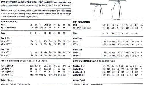 Description : 1980's Simplicity 9577 Vintage Sewing Pattern Misses' Jiffy Back-Wrap Skirt in Two Lengths: Top-stitched skirt softly gathered to waistband has patch pockets and ties that knot in front. V. 1 is short. V. 2 is long.